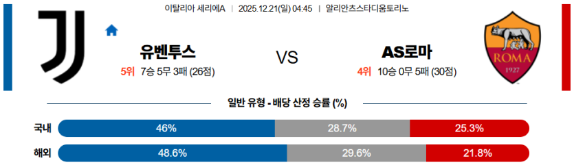 | 승패 예측 | AS 로마 승 | • 짠물 수비, 역습 효율, 유벤투스 뒷공간 |