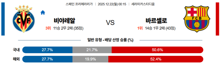 비야레알은 4-4-2 포메이션으로 중앙을 두껍게 하고 역습을 노리겠지만, 바르셀로나의 빠른 패스 워크에 고전할 가능성이 크다.