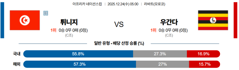 스포팡의 분석으로는 튀니지가 **조직적인 측면 공략과 세트피스 한 방**을 앞세워, 수비 조직력이 허술한 우간다를 상대로 **대승**을 거둘 것이다.