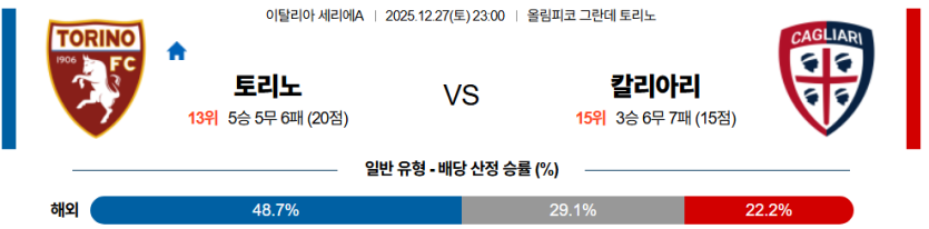 토리노 마핸 승이 유력하며, 칼리아리의 득점력 부재를 고려해 **언더**를 추천한다.
