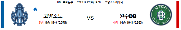 2025년 12월 27일 14:00 KBL, 고양 소노와 원주 DB의 맞대결이 고양체육관에서 펼쳐집니다. 홈팀 고양 소노는 최근 울산 모비스를 제압하며 4연패의 사슬을 끊어냈고, 원주 DB 역시 정관장을 상대로 승리하며 분위기를 다잡았습니다. 이번 경기는 높이의 우위를 점한 소노와 노련한 경기 운영의 DB가 격돌하는 중위권의 핵심 매치입니다.