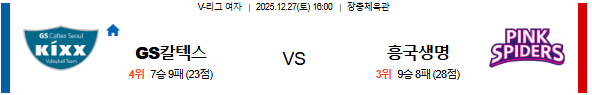 2025년 12월 27일 16:00 V-리그 여자부, GS칼텍스와 흥국생명의 맞대결이 장충체육관에서 열립니다. 홈팀 GS칼텍스는 최근 지젤 실바의 분전에도 불구하고 리시브 불안으로 리버스 스윕 패배를 당하며 분위기가 가라앉은 상태입니다. 반면 원정팀 흥국생명은 이나연 세터의 안정적인 조율 속에 3연승을 달리며 탄탄한 공수 밸런스를 과시하고 있습니다.