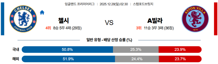 첼시는 개인 기량으로 맞불을 놓겠지만, 빌라의 조직적인 수비와 빠른 역습 전환에 고전하며 수비 밸런스가 무너질 가능성이 큽니다.
