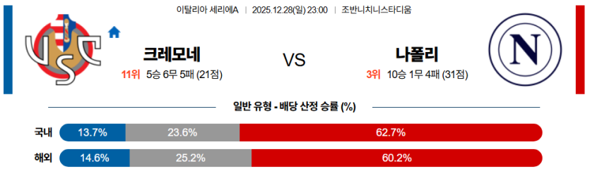 크레모네세는 라인을 내려 버티려 하겠지만, 측면 수비 조직력이 약해 나폴리의 **아이솔레이션 전술**에 속수무책으로 당할 가능성이 크다.