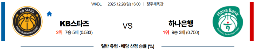 2025년 12월 28일 16:00 WKBL, KB스타즈와 하나은행의 시즌 세 번째 맞대결이 청주체육관에서 펼쳐집니다. 현재 리그 1위를 질주 중인 하나은행과 안방에서의 복수를 노리는 KB스타즈의 격돌입니다. KB스타즈는 직전 경기 패배의 아픔을 씻고 반등해야 하는 상황이며, 하나은행은 선두 자리를 굳건히 지키기 위한 중요한 일전을 앞두고 있습니다.