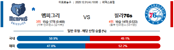| 핸디캡 예측 | 필라델피아 마핸 승(-1.5) | • 멤피스의 리바운드 열세 및 주전 부상 공백 공략 |