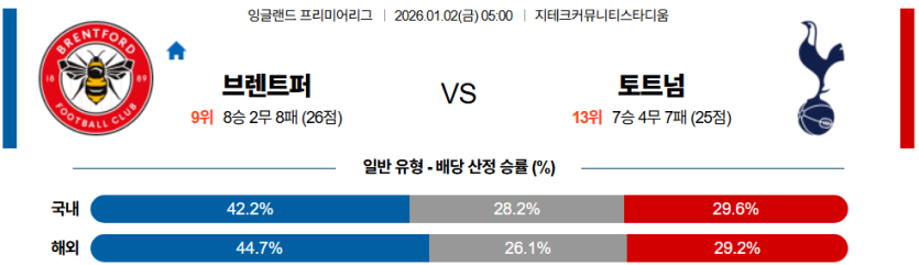 브렌트퍼드는 홈 이점을 등에 업고, 측면 공격수 **와타라의 빠른 발**을 이용해 토트넘의 뒷공간을 집요하게 파고들 것이다.