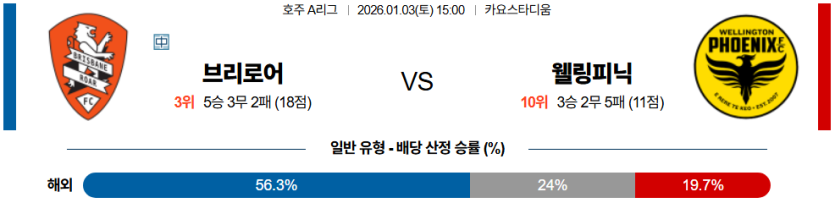 스포팡의 분석으로는 브리즈번 로어가 **클레인의 침투와 조직적인 2선 공격**을 앞세워, 수비 밸런스가 무너진 웰링턴 피닉스를 상대로 **대승**을 거둘 것이다.