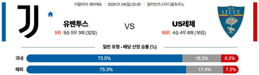 스툴리치와 피에로티를 앞세운 역습을 시도하겠지만, 유벤투스의 쓰리백은 전환 속도가 빠르고 대인 마크 능력이 뛰어나다. 레체가 공격을 전개하다 끊기는 순간, 오히려 유벤투스의 빠른 역습에 뒷공간을 내주며 자멸할 가능성이 크다.