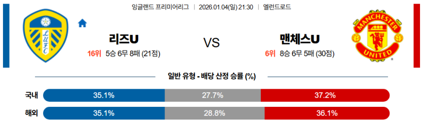 가장 안전한 선택은 맨유 승 (일반)이며, 리즈의 수비 불안을 고려해 **오버**도 좋은 선택이다.