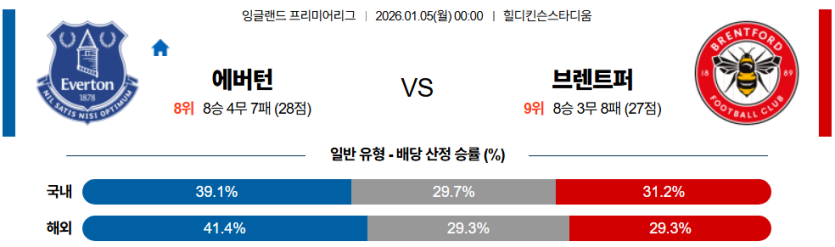 브렌트퍼드 승(역배)이 유력하며, 가장 안전한 선택은 브렌트퍼드 플핸 승(+0.5)이다. 에버턴의 수비 불안을 고려해 **오버**도 좋은 선택이다.
