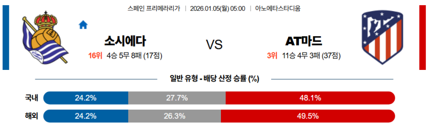 가장 안전한 선택은 AT 마드리드 승이며, 소시에다드의 빈공과 AT의 실리 축구를 고려해 **언더**를 추천한다.