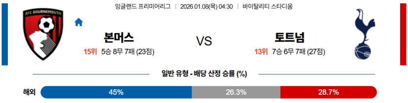 가장 합리적인 선택은 본머스 승이며, 핸디캡은 본머스 마핸 승(-0.5)이 정석이다. 토트넘의 득점 난조를 고려해 **언더**를 추천한다.