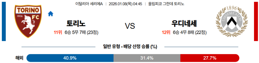 가장 안전한 선택은 토리노 승이며, 핸디캡(-0.5) 승리도 충분히 가능하다. 양 팀의 수비 불안 요소를 고려해 **오버**를 추천한다.