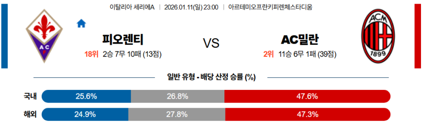 스포팡의 분석으로는 AC 밀란이 **안정적인 공수 밸런스**를 앞세워, 총체적 난국에 빠진 피오렌티나를 상대로 **승리**를 거둘 것이다.