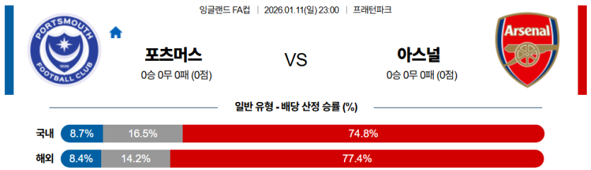 스포팡의 분석으로는 아스널이 **막강한 화력과 두터운 선수층**을 앞세워, 2부 리그의 포츠머스를 상대로 **승리**를 거둘 것이다.