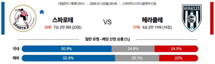 스포팡의 정밀 분석 결과, **수비 조직력과 세트피스 집중력**에서 스파르타 로테르담이 헤라클레스를 압도할 것입니다.