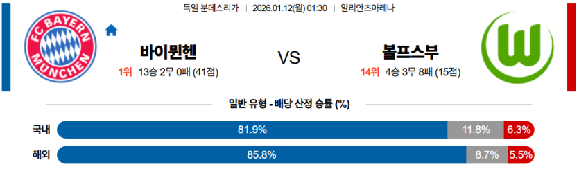 가장 안전한 선택은 바이에른 뮌헨 승이며, 핸디캡은 **바이에른 뮌헨 승 (-1.0)**까지 과감하게 노려볼 만하다. 뮌헨의 다득점과 볼프스부르크의 수비 붕괴를 고려해 **오버**를 추천한다.