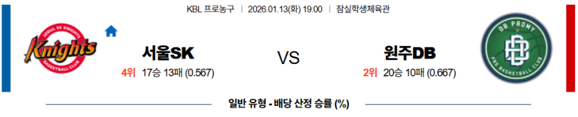 2026년 1월 13일 19:00, 잠실학생체육관에서 서울 SK와 원주 DB의 KBL 정규리그 맞대결이 펼쳐집니다. 홈팀 서울 SK는 직전 삼성전 충격패로 분위기가 가라앉았습니다. 자밀 워니가 고군분투하고 있지만, 리바운드 열세와 외곽 수비 붕괴라는 약점이 뚜렷합니다. 반면 원정팀 원주 DB는 최근 7연승을 질주하며 리그 2위의 위용을 과시하고 있습니다. 에삼 무스타파의 골밑 장악력과 이선 알바노의 지휘 아래 공수 밸런스가 완벽에 가깝습니다. 연패 위기의 SK와 연승 가도의 DB, 흐름이 극명하게 갈리는 두 팀의 승부입니다.