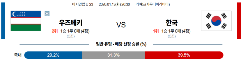 가장 안전한 선택은 대한민국 승이며, 핸디캡은 대한민국 마핸 승 (-0.5)으로 접근하여 승리 시 수익을 챙기는 것이 현명하다. 조별리그의 신중함을 고려해 언더를 추천한다.