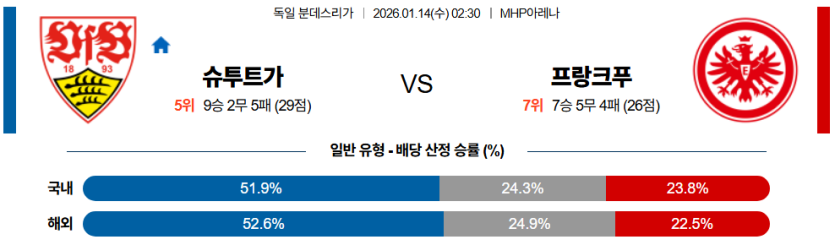 가장 안전한 선택은 슈투트가르트 승이며, 핸디캡은 슈투트가르트 마핸 승 (-0.5)으로 접근하여 승리 시 수익을 챙기는 것이 현명하다. 양 팀의 공격적인 성향을 고려해 오버를 추천한다.