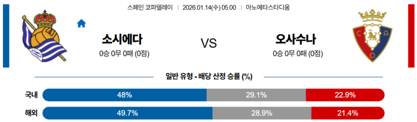 가장 안전한 선택은 소시에다드 승이며, 핸디캡은 소시에다드 마핸 승 (-1.0)으로 접근하여 승리 시 수익을 챙기는 것이 현명하다. 소시에다드의 화력과 오사수나의 수비 불안을 고려해 오버를 추천한다.