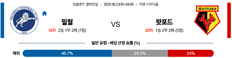 2025년 9월 23일 04시 00분, 잉글랜드 챔피언십에서 밀월FC와 왓퍼드가 맞붙는다.