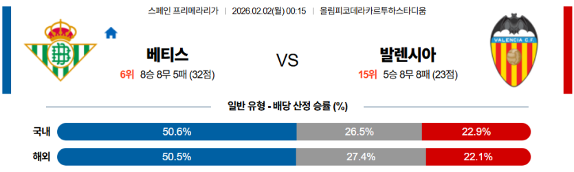 가장 합리적인 선택은 『발렌시아 CF 승』이며, 안전하게 수익을 내기 위해 『발렌시아 플핸 승 (+0.5)』을 강력 추천한다. 베티스의 수비 붕괴를 예상해 『2.5 기준 오버』를 공략하는 것이 현명하다.