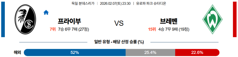 가장 합리적인 선택은 『SC 프라이부르크 승』이며, 안전하게 수익을 내기 위해 『프라이부르크 마핸 승 (-0.5)』을 강력 추천한다. 브레멘의 실점률을 고려해 『2.5 기준 오버』를 공략하는 것이 현명하다.