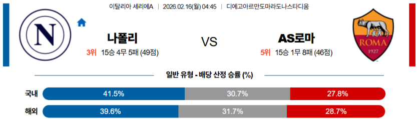 2026년 2월 16일 오전 4시 45분, 이탈리아 세리에 A를 대표하는 라이벌 매치인 SSC 나폴리와 AS 로마가 맞붙는다. 이번 '태양의 더비'는 '박스 앞 세컨볼 싸움'이 승패를 가를 핵심이다. 홈팀 나폴리는 노아 랑의 측면 돌파 후 발생하는 혼전 상황에서 호일룬과 맥토미니가 득점을 노리는 패턴이 위력적이다. 반면 원정팀 AS 로마는 윙백 전진 시 수비 간격이 벌어지며 박스 앞 위험 지역을 노출하는 약점을 가지고 있다. 나폴리가 후반전 집중력을 발휘해 로마의 수비를 무너뜨릴 가능성이 매우 높다.