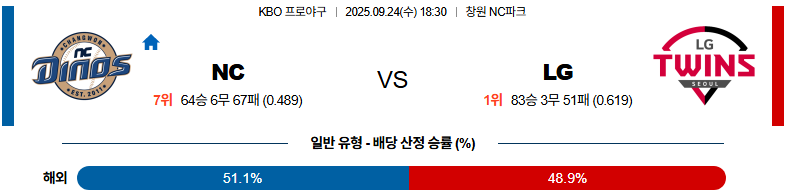 2025년 9월 24일 18시 30분, NC 다이노스와 LG 트윈스가 맞붙는다.