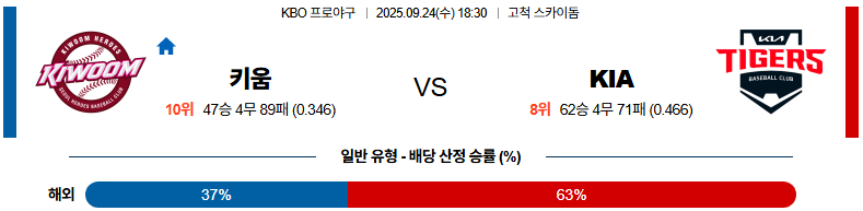2025년 9월 24일, 키움 히어로즈와 KIA 타이거즈의 맞대결이 진행된다.