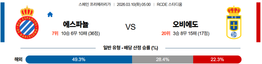 스포팡의 분석으로는 전진 압박 후 뒷라인 커버가 늦어 세컨드 라인을 스스로 헌납하는 오비에도를 에스파뇰의 유려한 전개와 하비 푸아도의 대포알 슈팅이 무자비하게 농락하며, 홈팀 에스파뇰이 압도적인 점유율과 득점 찬스를 챙길 것으로 판단된다.