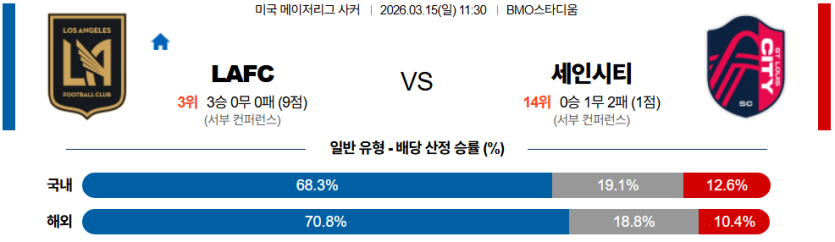 전력 지표와 전술 상성이 증명하듯 홈팀 LAFC의 일방적인 우세가 확실시되는 매치업이다. LAFC가 손흥민의 압박과 부안가의 결정력을 바탕으로 세인트루이스의 수비벽을 철저히 붕괴시켜 2골 차 이상의 넉넉한 승리를 쟁취할 것이 유력하므로, 배당 효율을 극대화하며 온전히 수익을 챙길 수 있는 가성비 극강의 안전 픽 『LAFC 마핸승 (-1.0)』을 최우선 주력 픽으로 강력히 권장한다. 또한, 세인트루이스의 어설픈 후방 전개가 LAFC의 파상공세에 갈기갈기 찢겨나가며 일방적인 대량 득점 파티가 벌어질 최적의 환경이 조성되어 있으므로 『오버 (3.0)』 역시 절대 놓쳐서는 안 될 탁월한 시너지 선택지가 될 것이다.