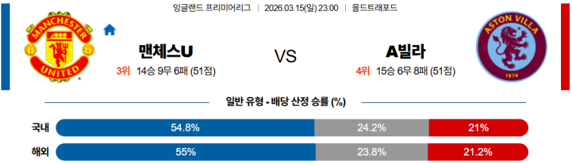 이 경기는 맨유의 전술적 완승과 함께 애스턴 빌라의 공격 고립에 따른 저득점(언더) 양상이 유력하게 기대된다.