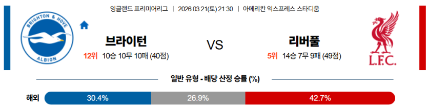 이 경기는 브라이튼의 전술적 신승(역배)과 함께 리버풀의 기동력 상실에 따른 저득점(언더) 양상이 유력하게 기대된다.