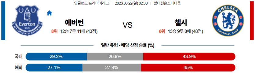 2026년 3월 22일 오전 2시 30분, 잉글랜드 프리미어리그(EPL) 무대에서 에버턴과 첼시가 맞대결을 펼친다. 이번 경기는 '충분한 휴식을 취한 뒤 미친 기동력으로 세컨볼을 독식하며 상대의 벌어진 간격을 무자비하게 찌르는 홈팀과, 주중 챔피언스리그 파리 생제르맹 원정 혈투의 피로도 탓에 후반전 수비 밸런스가 끔찍하게 붕괴되는 원정팀의 충돌'이 승패를 결정지을 핵심 변수다. 홈팀 에버턴은 맥닐의 파괴적인 측면 크로스와 바리의 묵직한 문전 장악력을 앞세워 체력이 고갈된 첼시의 헐거운 수비 블록을 난도질할 준비를 마쳤다. 반면 원정팀 첼시는 델랍과 콜 파머라는 훌륭한 공격진을 보유하고도, 살인적인 일정으로 인해 미드필더의 수비 커버가 늦어지며 경기 후반 치명적인 실점 위기를 스스로 초래하는 고질병을 앓고 있다. 전술적 공간 지배력과 압도적인 체력 에너지 레벨에서 확연한 우위를 점한 에버턴이 안방에서 대이변을 연출하며 경기를 완벽하게 통제할 가능성이 높게 평가된다.