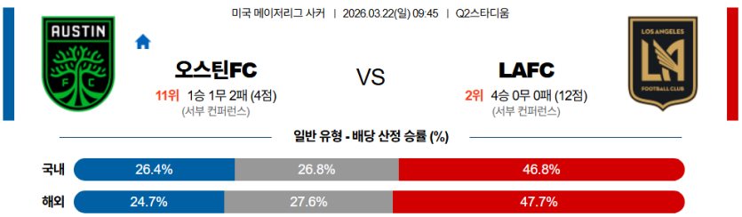 전력 지표와 세부 전술의 완성도가 증명하듯 원정팀 LA FC의 우세가 확실시되는 매치업이다. LA FC가 빠르고 간결한 전개를 바탕으로 오스틴의 수비벽을 철저히 붕괴시킬 것이 유력하므로, 1골 차의 끈적한 승부가 연출되더라도 배당 효율을 극대화하며 온전히 수익을 방어할 수 있는 가성비 극강의 안전 픽 『LA FC 마핸승 (-0.5)』을 최우선 주력 픽으로 강력히 권장한다. 또한, 오스틴의 뻔한 공격 전개가 철저히 봉쇄되고 수비 간격이 박살 나며 LA FC의 일방적인 맹폭이 이어져 득점 파티가 벌어질 확률이 짙으므로, 득점이 3골 이상 터질 환경을 반영한 기준점 『오버 (2.5)』 역시 절대 놓쳐서는 안 될 탁월한 시너지 선택지가 될 것이다.