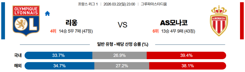 전력 지표와 세부 전술의 완성도가 증명하듯 원정팀 모나코의 우세가 확실시되는 매치업이다. 모나코가 스위칭 패스와 컷백을 바탕으로 리옹의 수비벽을 철저히 붕괴시킬 것이 유력하므로, 1골 차의 끈적한 승부가 연출되더라도 배당 효율을 극대화하며 온전히 수익을 방어할 수 있는 가성비 극강의 안전 픽 『AS 모나코 마핸승 (-0.5)』을 최우선 주력 픽으로 강력히 권장한다. 또한, 리옹의 어설픈 수비 간격이 박살 나고 모나코의 일방적인 맹폭이 이어지며 득점 파티가 벌어질 확률이 짙으므로, 득점이 3골 이상 터질 환경을 반영한 기준점 『오버 (2.5)』 역시 절대 놓쳐서는 안 될 탁월한 시너지 선택지가 될 것이다.