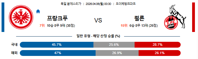 | 26년 4월 6일 00:30 분데스리가 분석 프랑크푸르트 vs 쾰른 [스포팡] (0) | 2026.04.04 |