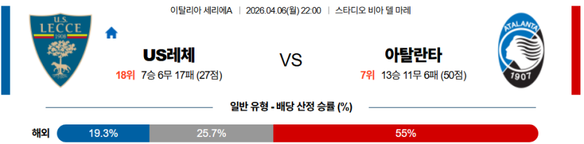 2026년 4월 6일 오후 10시, 이탈리아 세리에 A 무대에서 US 레체와 아탈란타 BC가 맞대결을 펼친다. 이번 경기는 '박스 안 첫 번째 경합에서 간신히 버텨내더라도, 이어지는 세컨볼과 리바운드 대응이 끔찍하게 늦어지며 가장 치명적인 아크 정면 공간을 스스로 헌납하는 홈팀과, 그 갈라진 틈을 귀신같이 포착해 정교하게 약속된 세트피스 패턴과 파괴적인 2선 쇄도로 수비 블록을 박살 내는 원정팀의 충돌'이 승패를 결정지을 핵심 변수다. 원정팀 아탈란타는 데 케텔라에르의 완벽한 템포 조율과 에데르송의 예리한 박스 앞 장악력을 앞세워 레체의 헐거운 수비 라인을 무자비하게 난도질할 준비를 마쳤다. 반면 홈팀 레체는 피에로티와 라마다니라는 준수한 자원을 보유하고도, 구조적인 세컨볼 대처 지연과 공수 간격 유지 실패로 인해 경기 내내 치명적인 슈팅 위기를 스스로 초래하는 고질병을 앓고 있다. 전술적 공간 지배력과 파이널 서드 타격 완성도에서 확연한 우위를 점한 아탈란타가 원정임에도 경기를 완벽하게 통제할 가능성이 높게 평가된다.