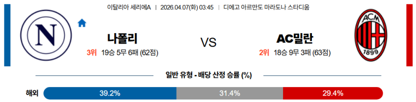 2026년 4월 7일 오전 3시 45분, 이탈리아 세리에 A 무대에서 SSC 나폴리와 AC 밀란이 맞대결을 펼친다. 이번 경기는 '전반에는 짧은 패스로 점유율을 쥐고 흔들며 상대를 지치게 만들고, 후반에는 간결하고 파괴적인 롱패스로 템포를 급변시키며 수비 라인을 완전히 붕괴시키는 홈팀과, 단조로운 공격 패턴 탓에 상대의 변칙적인 템포 조절에 적응하지 못하고 스스로 공격의 활로를 잃어버리는 원정팀의 충돌'이 승패를 결정지을 핵심 변수다. 홈팀 나폴리는 2선의 완벽한 전진 패스와 스트라이커의 예리한 배후 공간 침투를 앞세워 밀란의 헐거운 수비 라인을 무자비하게 난도질할 준비를 마쳤다. 반면 원정팀 AC 밀란은 전방에 위협적인 타깃맨을 보유하고도, 구조적인 템포 적응 실패와 중원 전개 차단으로 인해 경기 내내 치명적인 빈공에 시달리는 고질병을 앓고 있다. 전술적 공간 지배력과 경기 템포 조절 능력에서 확연한 우위를 점한 나폴리가 안방에서 경기를 완벽하게 통제할 가능성이 높게 평가된다.
