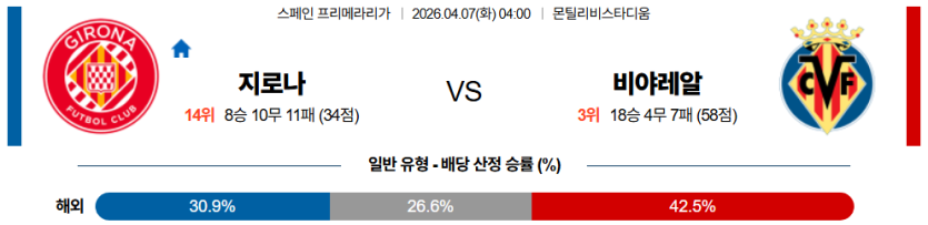 스포팡의 분석으로는 수비 간격 조율에 실패하며 치명적인 박스 앞 공간을 스스로 헌납하는 지로나를 상대로, 비야레알이 압도적인 전술적 유연성과 파괴적인 하프스페이스 침투를 앞세워 경기 내내 주도권을 쥐고 신승 이상을 거둘 것으로 판단된다.