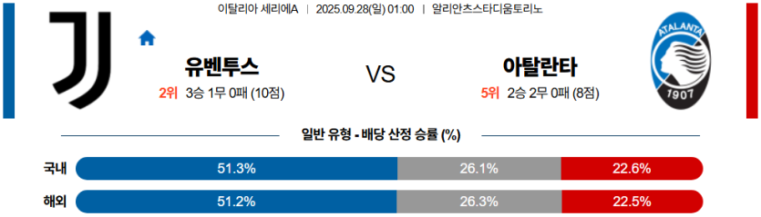 유벤투스는 일디즈-로카텔리-데이비드 축을 중심으로 단순하면서도 직선적인 공격 루트를 만든다. 아탈란타 역시 스카마카와 파살리치의 스위칭, 데 케텔라에르의 연계를 반복한다. 양 팀 모두 플랜B가 없고 완고한 전술 운영으로 인해 경기 흐름이 단조로울 가능성이 크다. 따라서 경기는 치열하지만 균형이 쉽게 무너지지 않으며, 무승부 가능성이 높다.