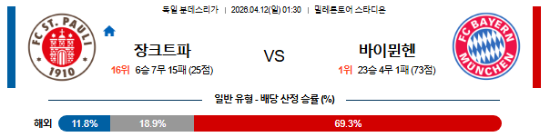 2026년 4월 12일 자정, 독일 분데스리가 무대에서 FC 장크트파울리와 바이에른 뮌헨이 맞대결을 펼친다. 이번 경기는 '수비형 미드필더의 위치 선정이 매끄럽지 못해 답답한 U자형 후방 빌드업을 남발하며 치명적인 턴오버를 헌납하는 원정팀과, 강등권 탈출이라는 절박한 동기부여를 바탕으로 거친 전방 압박과 날카로운 하프스페이스 쇄도를 통해 수비 블록을 박살 내는 홈팀의 충돌'이 승패를 결정지을 핵심 변수다. 홈팀 FC 장크트파울리는 투톱과 2선의 촘촘한 간격을 유지하며 바이에른 뮌헨의 헐거운 후방 라인을 무자비하게 난도질할 준비를 마쳤다. 반면 원정팀 바이에른 뮌헨은 무시알라, 나브리 등 걸출한 자원들을 보유하고 있음에도, 챔피언스리그 레알 마드리드 원정 직후라는 살인적인 일정 탓에 구조적인 기동력 저하와 전진 패스 차단으로 인해 경기 내내 치명적인 실점 위기를 스스로 초래하는 약점을 노출하고 있다. 전술적 압박 강도와 절박함에서 확연한 우위를 점한 FC 장크트파울리가 안방에서 이변을 연출할 가능성이 높게 평가된다.