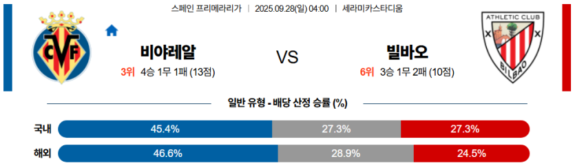 2025년 9월 28일 04시, 라리가에서 비야레알과 아틀레틱 빌바오가 맞붙는다.