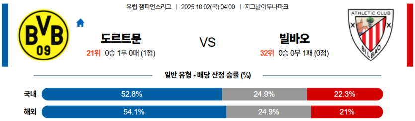 2025년 10월 2일 04시, UEFA 챔피언스리그에서 도르트문트와 아틀레틱 빌바오가 격돌한다.