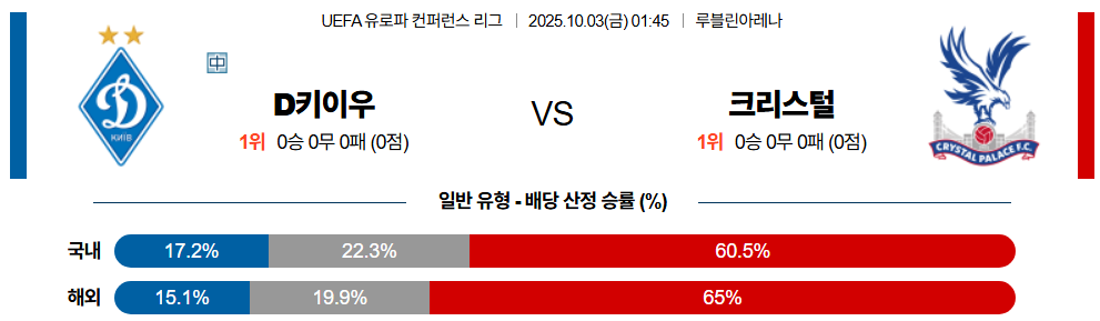 스포팡 분석 기준으로 보면, 디나모 키이우의 약점은 분명하고, 팰리스의 전환과 결정력은 확실하다. 따라서 팰리스 승리가 가장 합리적인 선택이다.