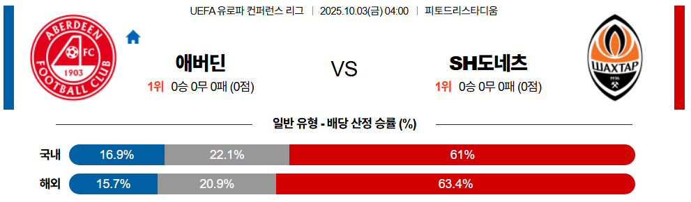 스포팡 분석 기준으로 보면, 에버딘의 안정적인 수비 운영에도 불구하고 샤흐타르의 펄스나인 전술이 상성을 깨뜨리며 승리를 가져갈 가능성이 높다.