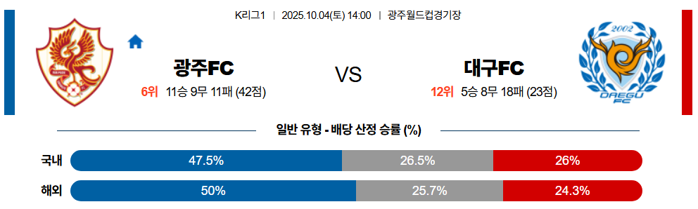 광주의 실리 운영과 대구의 제한적 공격이 맞물리며 득점 기대값이 낮은 무승부 흐름이 강하다.